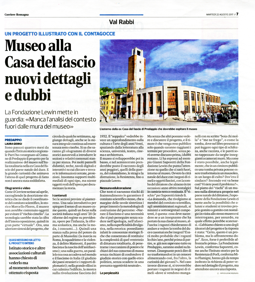 Museo alla Casa del Fascio, nuovi dettagli e dubbi Pubblicato su agosto 29, 2017 da fondazioneLewin Lascia un commento Articolo comparso sul Corriere di Romagna del 22 agosto 2017 Condividi: Fai clic per condividere su X (Si apre in una nuova finestra) X Fai clic per condividere su Facebook (Si apre in una nuova finestra) Facebook Mi piace Caricamento...